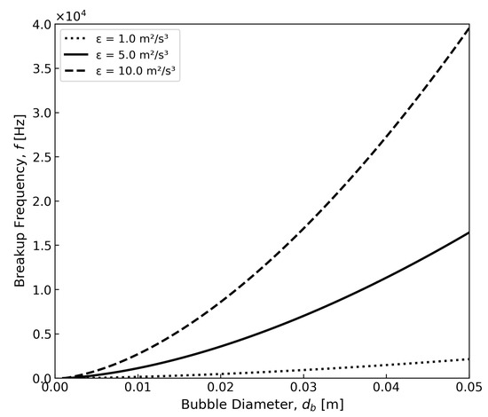 Variation in bubble breakup frequency with turbulent dissipation rate and bubble diameter.