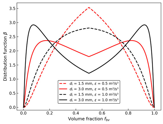 Figure 2 illustrates the variation in bubble breakup frequency with bubble diameter and turbulent dissipation rate, as predicted by the model of Lehr et al. [28]. The results show that the breakup frequency increases significantly with both the bubble diameter and the turbulent energy dissipation rate (ε). For small bubbles (<0.01 m), the breakup frequency remains relatively low, while for larger bubbles the breakup frequency rises steeply, especially under higher turbulence intensities (ε = 5.0 and 10.0 m2/s3). As shown in Figure 3, Lehr et al.’s daughter bubble volume distribution model is characterized by the fact that, as bubble size increases, the turbulent kinetic energy in the surrounding flow field grows, and more readily develops a maximum at an offset of 0.5—i.e., it tends toward unequal size breakup. Conversely, smaller bubbles reside in regions of lower turbulent kinetic energy, and the function more readily exhibits a peak at 0.5—i.e., the breakup tends toward two daughter bubbles of nearly equal volume.