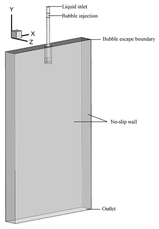 The boundary conditions for the liquid phase are configured as follows. As illustrated in Figure 4, the liquid inlet is specified as a mass flow inlet. Bubbles are introduced from the inner wall of the submerged entry nozzle. The side walls of the water model and the nozzle wall are set to no slip conditions for the liquid and rebound conditions for the bubbles. The top surface serves as the outlet for the gas phase and as a free slip wall for the liquid. The initial diameter of the injected bubbles is 0.893 mm, in accordance with Wu et al. [29].