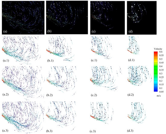 Snapshot of trajectories of bubbles within diameter range of (a) 1–1.5 mm, (b) 1.5–2 mm, (c) 2–2.5 mm, (d) above 2.5 mm at gas flow rate of 400 mL·min−1. The first row shows the experimental results reprinted with permission from ref. [12]. Copyright 2021, Elsevier. and (x.1), (x.2), and (x.3) correspond to Case 1, Case 2, and Case 3, respectively. In detail, (a.1) 1–1.5 mm bubbles in Case 1; (a.2) 1–1.5 mm bubbles in Case 2; (a.3) 1–1.5 mm bubbles in Case 3. Similarly, (b.1) 1.5–2 mm bubbles in Case 1; (b.2) 1.5–2 mm bubbles in Case 2; (b.3) 1.5–2 mm bubbles in Case 3. (c.1) 2–2.5 mm bubbles in Case 1; (c.2) 2–2.5 mm bubbles in Case 2; (c.3) 2–2.5 mm bubbles in Case 3. (d.1) Above 2.5 mm bubbles in Case 1; (d.2) Above 2.5 mm bubbles in Case 2; (d.3) Above 2.5 mm bubbles in Case 3.