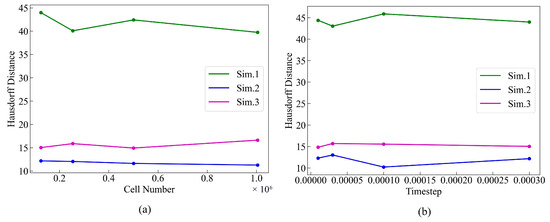 Grid and time step independence analysis based on Hausdorff distance error between simulation and experimental trajectories. (a) The effect of cell number on Hausdorff distance, with a fixed time step of 0.0001 s. (b) The effect of time step on Hausdorff distance, with a fixed grid number of 253,756.