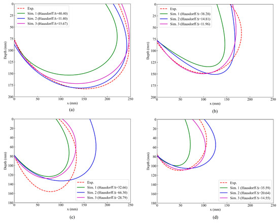 Figure 7 enclosing trajectories of bubbles over a 60 s period at a gas flow rate of 400 mL⋅min−1. The bounding lines in this figure were obtained using a least-squares method, with an added tolerance to ensure that only the main bubble trajectories were enclosed, avoiding the influence of non-primary gas flows. Unlike Figure 5, which shows bubble trajectories at a specific moment, this figure presents the statistical results over the entire 60 s period. The analysis revealed that extending the statistical time beyond 60 s had minimal impact on the results, confirming the robustness of the findings. Deviations from the experimental data are quantified using Hausdorff distance, a metric that measures the maximum distance between points on two sets (in this case, the predicted and experimental bubble trajectories). Smaller values of Hausdorff distance indicate better agreement between the simulation results and the experimental data. When comparing the performance of the models across all four plots, Case 3 (Roghair model) shows the smallest Hausdorff distance, indicating the best alignment with the experimental data. Furthermore, Case 3 exhibited the greatest improvement in reducing the error compared to Case 1 (no correction model). On average, Case 3 reduced the error by 51.7%, which is significantly better than the 23.0% improvement achieved by Case 2 (Garnier model). This further confirms the superior performance of the Roghair model in capturing the bubble flow behavior and enhancing the accuracy of the simulation results.