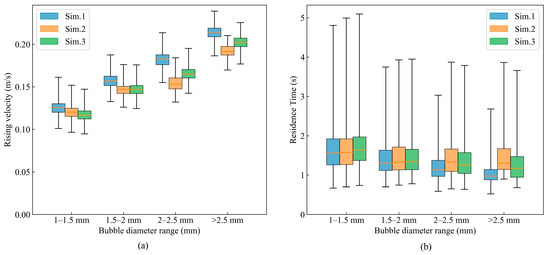 As shown in Figure 8a, across all simulations, the median rising velocity increases with bubble diameter, as expected from buoyancy. Introducing swarm-drag corrections lowers the rising velocity compared with Sim. 1 (no correction). The extent of the reduction depends on the correlation: for small bubbles (1.0–1.5 mm), Sim. 3 (Roghair et al. [19]) yields slightly lower velocities than Sim. 2 (Garnier et al. [11]), consistent with a larger correction factor f(α) predicted by Roghair et al. for small diameters. In contrast, for larger bubbles (2.0–2.5 mm and >2.5 mm), Sim. 2 produces the lower rising velocity, which aligns with Garnier et al. [11] giving a larger f(α) than Roghair et al. [19] at these diameters and typical local volume fractions. The 1.5–2.0 mm class shows intermediate behavior with only a modest difference between the two correlations. As shown in Figure 8b, the residence time exhibits the opposite trend to rising velocity. Both correlations increase the residence time relative to Sim.1, reflecting the reduced slip caused by the higher effective drag. Consistent with the rising velocity trends, Sim. 3 tends to give longer residence times for 1.0–1.5 mm bubbles, whereas Sim. 2 yields longer residence time for 2.0–2.5 mm and >2.5 mm bubbles.