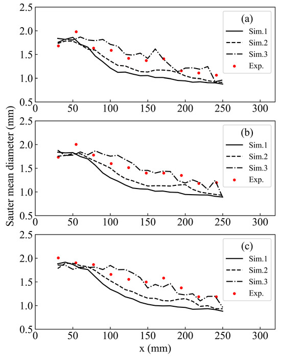In Figure 8, the separation among Sim. 1–3 is more pronounced for the two largest classes (2.0–2.5 mm and >2.5 mm). Larger bubbles mainly rise within the near-nozzle region where the gas holdup is highest; because the swarm-drag amplification increases with the local volume fraction, the effective drag is strengthened there, leading to a greater reduction in rising velocity and a longer residence time than for the smaller-diameter classes. The size-dependent trends in Figure 8 rationalize the trajectory differences reported in Figure 5. Whenever a swarm-drag correlation yields a stronger increase in the effective drag for a given diameter class, the slip and rise velocities are reduced and the bubble residence time is extended. The longer residence near the jet–impingement region exposes bubbles to the horizontal steel stream for a greater duration, which explains the observed changes in travel distance in Figure 5. Conversely, when the swarm-drag amplification is weaker, bubbles exit the jet sooner, producing shorter paths and larger mismatches with the measured trajectories.