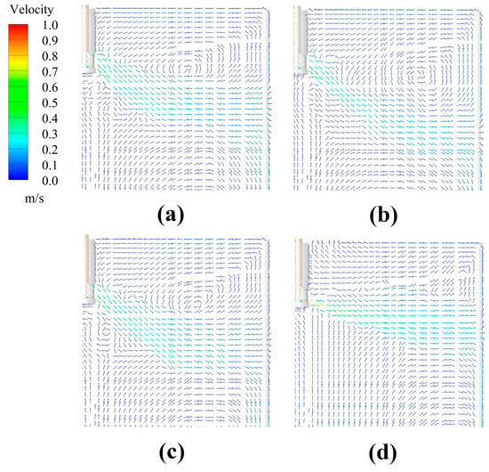 In Case 1, without any swarm drag correction (Figure 10b and Figure 11b), the flow field shows only moderate disturbance near the injection region. Because the drag coefficient on the bubbles is underestimated, the overall flow pattern remains largely unchanged apart from localized turbulence. By contrast, Case 2, which applies the Garnier model (Figure 10c and Figure 11c), produces noticeably stronger disturbances. The drag corrected for bubble–bubble interactions drives more vigorous liquid motion and generates a more complex flow structure around the nozzle compared with Case 1. In Case 3, employing the Roghair model (Figure 10d and Figure 11d), yields the most significant alteration of the flow field. The drag, fully corrected for swarm effects, induces intense disruption of the liquid stream. The bubbles’ entrainment of the steel flow produces a clearly visible lifting effect.