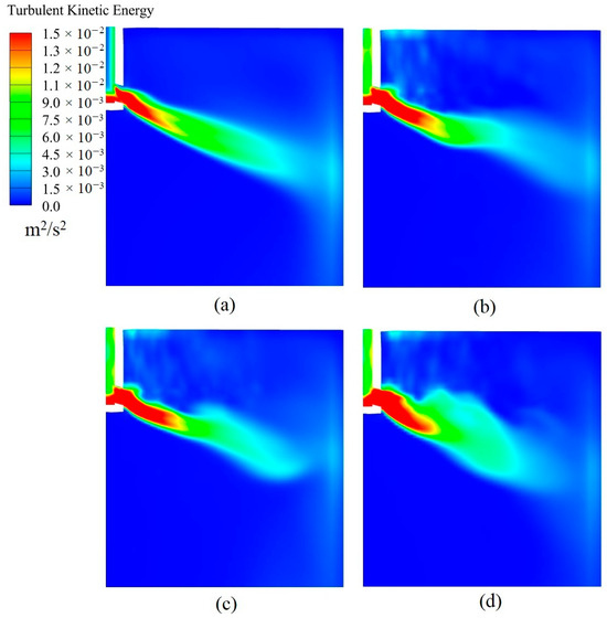 Contours of turbulence kinetic energy (a) No bubble injection, (b) Case 1 (no swarm-drag correction), (c) Case 2 (using the Garnier et al. (Adapted from Ref. [11]) model), (d) Case 3 (using the Roghair et al. (Adapted from Ref. [19]) model).