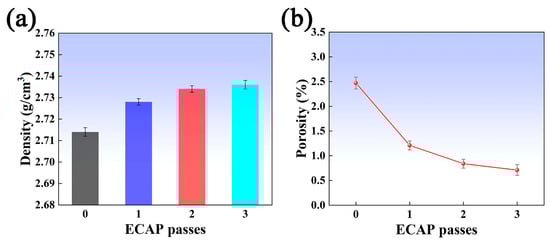 - ECAP significantly improves hardness: microhardness increases to 107.6 HV (one-pass), 118.5 HV (two-pass), and 122.3 HV (three-pass)—representing 40.6% and 45.1% increases versus as-cast for two-pass and three-pass, respectively. Density increases while porosity decreases (0.72% after three passes).