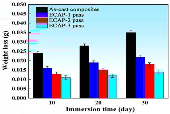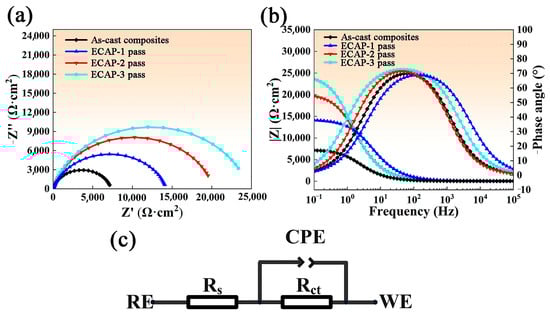 - ECAP processing reduces corrosion susceptibility by (i) diminishing Icorr and achieving a 3.4-fold Rct increase through grain refinement and homogeneous phase dispersion, which suppress electrochemical heterogeneity and micro-galvanic coupling; (ii) reducing corrosion groove depth from 37.58 µm (as-cast) to 16.73 µm (three-pass) by mitigating interfacial strain mismatch; and (iii) impeding electrolyte infiltration via porosity reduction.