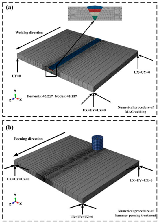 - Boundary conditions were consistent with those in the experiments. That is, being in a free state during the MAG welding process does not affect the deformation and rigid slip of the sheet material; whereas, the model is completely fixed during the impact treatment process, as shown in Figure 4.