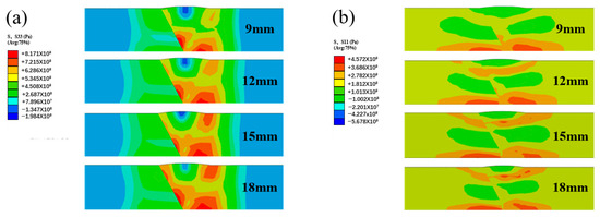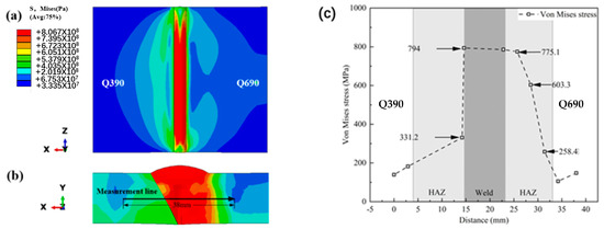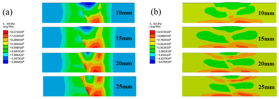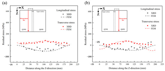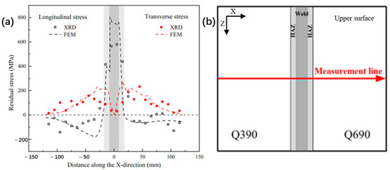 - The residual stress in longitudinal and transverse components is mainly tensile. Lateral residual stress, on the other hand, exhibits the opposite trend due to different cooling shrinkage effects. Overall, longitudinal residual stresses dominate in welds and heat-affected zones. The difference in strength results in different equivalent stress gradients on both sides of the fusion zone.