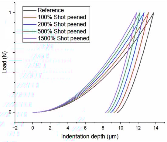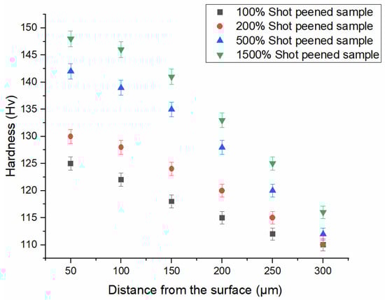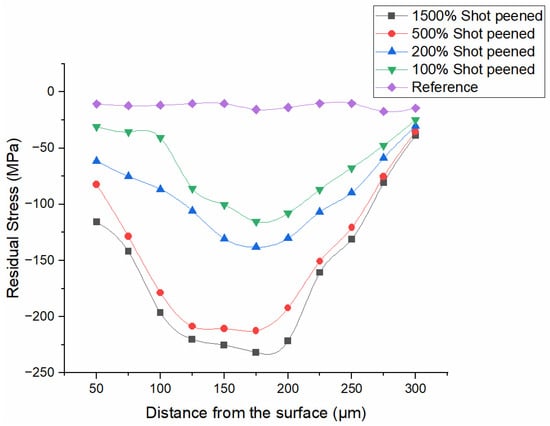 - The highest hardness value was obtained for the SP1500 sample, but it did not exhibit a significant increase in comparison to the SP500 sample. The same behavior was also observed for residual stress profiles.
