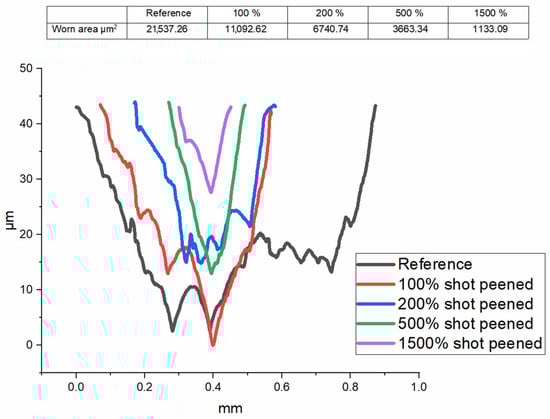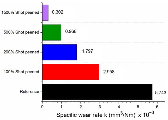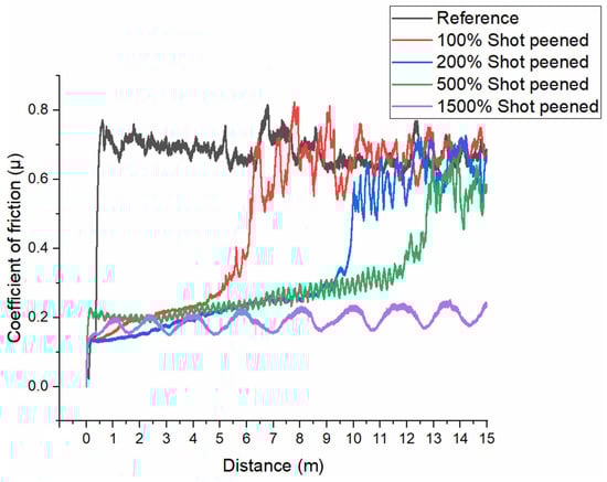 - The obtained COF values showed that shot peening effectively enhanced tribological performance by altering surface characteristics, although its benefits were highly dependent on the coverage rate of the shot peening process. The mean COF values for the Sref, SP100, SP200, SP500, and SP1500 samples were obtained as 0.67, 0.66, 0.62, 0.57, and 0.19, respectively.