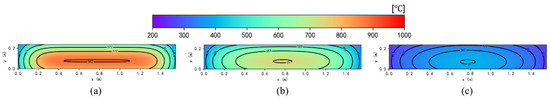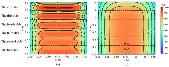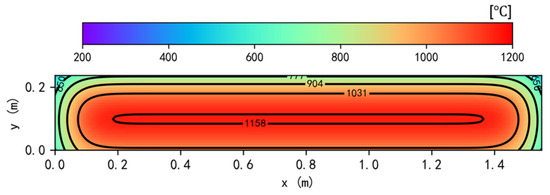 To enhance the accuracy of the initial temperature field in numerical simulations, an optimization process was performed for the continuous casting slab’s temperature distribution. We took the section temperature of the slab after flame cutting as the initial temperature. This initial temperature was calculated as follows. First, we assumed that the temperature of the slab section is uniformly 1200 °C. Then, through calculation, the process continued until the center point of the upper surface reached the actual measured temperature of the upper surface center point after the flame cutting. The resulting temperature field at this moment was used as the initial condition for subsequent computations. The temperature distribution of slab cutting is displayed in Figure 2.