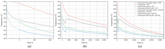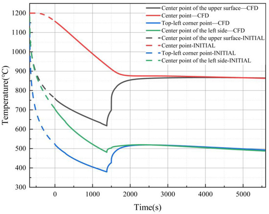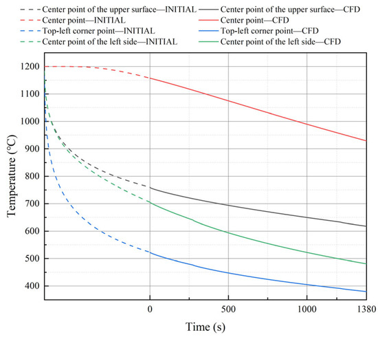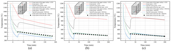 Figure 3 shows the thermal history of a specific continuous casting slab. The dashed portion of the curve represents the rate of temperature change with time before flame cutting, while the solid portion indicates the rate of temperature change after cutting. The dashed lines in the figure represent the gradual cooling of the slab from 1200 °C until it reaches the temperature for flame cutting. In the subsequent figures, the initial temperature optimization process of the slab is illustrated using dashed lines. By capturing these thermal transitions, the initial temperature field more accurately reflects the slab’s actual conditions, thereby improving the reliability of the computational model in subsequent analyses. This approach ensures that the model accounts for significant thermal events, such as flame cutting, that induce spatial and temporal variations in temperature distribution. Such considerations are critical for improving the fidelity of simulations in thermal engineering applications involving continuous casting slabs.