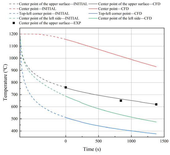 Figure 4 also illustrates the experimental validation of the slab cooling process during transport. In the figure, the x-axis origin (time = 0) represents the moment of flame cutting. Negative x-axis values correspond to the cooling phase before cutting, starting from the initial uniform slab temperature of 1200 °C. The simulation began at this uniform temperature and was calculated until the flame-cutting surface center-point temperature was obtained, which served as the initial temperature field for subsequent calculations. In the graph, the dashed curve represents the simulated temperature drop before flame cutting, while the solid curve represents the temperature drop after cutting. A schematic of the slab is included in the lower-left corner of the figure, with key points marked, including the center point of the top surface (black dot) and the center point of the cross-section (red dot). These points were used as reference locations for validation and comparison.