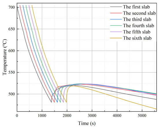 Figure 8 displays the temperature variation curves of the center points on the upper surfaces of different continuous casting slabs within the stack, providing clear information on the number of slabs in the stack, their stacking order, and the time intervals at which they were added. The newly added slabs had just completed the transportation phase, and because the transportation time was significantly shorter than the stacking phase, they retained relatively high temperatures. Consequently, their heat loss during transportation was minimal. In contrast, slabs already in the stack experienced rapid heat loss from their upper surfaces due to faster heat transfer, resulting in a more significant cooling rate. When a new slab was added, its hot lower surface contacted the much cooler upper surface of the top slab in the stack. The large temperature difference caused rapid heat transfer, raising the top slab’s surface temperature. This effect appeared in the temperature curves, showing the dynamic heat transfer during slab addition.