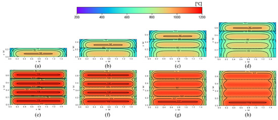 Figure 9 displays the temperature distribution cloud map of the stack, considering the stacking sequence. As shown in Figure 9a–d, the number of slabs within the stack increased dynamically, reaching a total of four slabs. With each addition, the heat transfer conditions within the stack evolved, altering the heat transfer dynamics. For example, initially, the upper surface of the first slab was in contact with the air. As the second slab was stacked on top, the boundary condition of the upper surface of the first slab then changed to contact between solids. These changes were reflected in the temperature distribution, underscoring the importance of considering the dynamic stacking process in thermal models. As shown in Figure 9e–h, without considering dynamic stacking, the entire stack would be regarded as a single entity. Because of the failure to consider the changes in the slab boundary conditions, the accuracy of the temperature prediction was consequently reduced. By incorporating these dynamic boundary conditions, the simulation provided a more accurate representation of the thermal behavior, enhancing the reliability of predictions in industrial stacking operations.