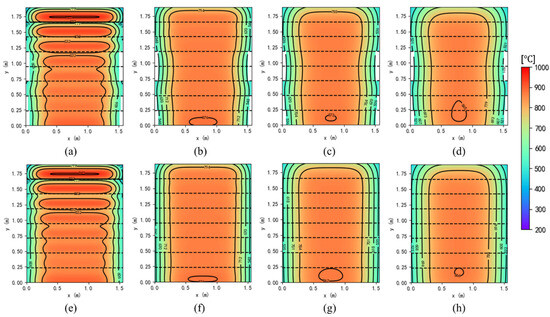 The temperature of continuous casting slabs with different sections and different cooling times: (a) t = 2220 s, different sections; (b) t = 3000 s, different sections; (c) t = 4000 s, different sections; (d) t = 5000 s, different sections; (e) t = 2220 s, same sections; (f) t = 3000 s, same sections; (g) t = 4000 s, same sections; (h) t = 5000 s, same sections.