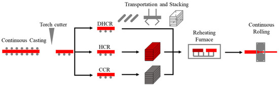 The common flow of the casting and rolling connection process is shown in Figure 11. In continuous casting–hot rolling integrated production, direct hot-charge rolling (DHCR), hot-charge rolling (HCR), and cold-charge rolling (CCR) are all connection modes between the casting and rolling processes. The common goal of these processes is to ensure the quality of the steel while achieving smooth process integration and temperature control, thereby enhancing energy utilization and production efficiency. DHCR refers to the direct transfer of the cast slab to a heating furnace for heating before rolling. This process makes full use of the residual heat during the casting process, achieving the lowest energy consumption and the highest operational efficiency. However, it requires strict equipment layout, production rhythm, and scheduling accuracy. HCR refers to the process where the temperature of the continuous casting slab is below the A1 temperature, above 400 °C, and the slab is not allowed to cool down before being sent to the reheating furnace for heating and subsequent rolling. HCR retains a portion of the sensible heat generated during continuous casting, and its energy consumption and connection efficiency are moderate. CCR refers to the cold loading rolling process. Slabs from the continuous casting machine are first cooled, usually to below 400 °C. They are then reheated in the furnace to the rolling temperature and finally sent to the hot rolling mill. This results in the highest energy consumption and the greatest scheduling flexibility for CCR, but with the lowest operational efficiency.