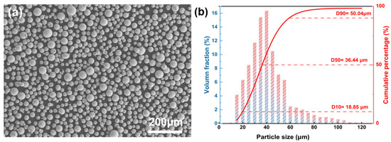 Table 1 316L powder used in this study was supplied by Jiangsu Vilory Advanced Materials Technology Co., Ltd. in Xuzhou, China. The powder exhibited a high degree of sphericity (≥99%) and a Hall flow rate of 12.1 s/50 g. The chemical composition of the powder, presented in Table 1, conforms to the ASTM A240 standard. The morphology and particle size distribution of the powder are shown in Figure 1a and Figure 1b, respectively. As can be seen, the median particle size Dv (50) = 20.81 μm, which is suitable for LPBF technology.