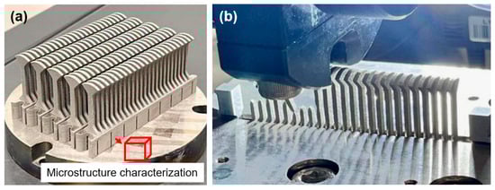 Traditional mechanical testing equipment would result in excessive time consumption and high costs. Therefore, a self-developed high-throughput testing platform was utilized to efficiently collect tensile testing data [26,27]. As shown in Figure 3, the experimental specimen consisting of a bottom cube sample and a top high-throughput tensile testing sample was fabricated with various parameters, where the Small red square samples were used to assess their relative density and microstructure. Cube shape with dimensions of 10 mm × 10 mm × 10 mm. The remaining portion serves as the high-throughput tensile specimen, and detailed testing conditions can be found in reference [25]. Figure 3b illustrates the high-throughput mechanical property testing process, testing specimens one by one.