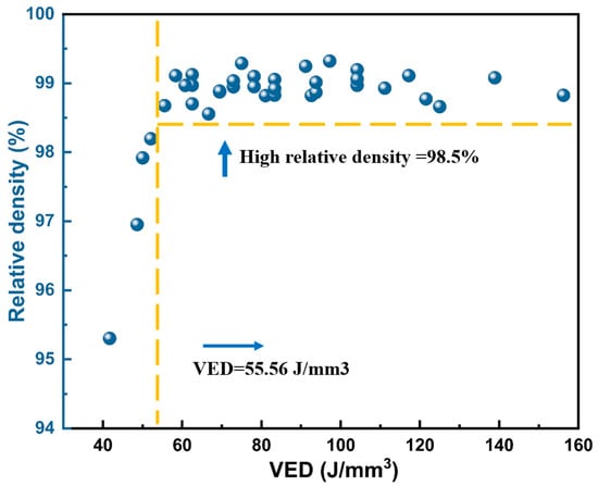 The relationship between VED and the relative density for LPBF-fabricated SS 316L.