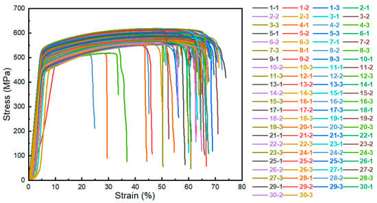 In order to effectively evaluate the mechanical properties of the material within the defined densification range, we used a self-developed high-throughput tensile testing platform to conduct tensile tests on the specimens. For each process parameter, three specimens were tested, respectively. The high-throughput tensile curves obtained are shown in Figure 5, and the experimental results are summarized in Table 3. These curves originated from 108 tests reported in reference [25] (36 sets of process parameters, each repeated 3 times); after screening based on the criterion of relative density ≥ 98.5%, 90 curves were retained from the highly densified specimens (30 sets of process parameters, each repeated 3 times).