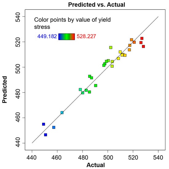 To assess the goodness of fit and prediction accuracy of the response model, this study compared the predicted values with the experimental values. Figure 7 presents the fitting plot of predicted versus experimental values for the yield strength of LPBF-formed SS 316L. The predicted and experimental values are closely aligned on both sides of the straight line, with minimal deviation. The points in Figure 7 are approximately linearly distributed, further validating the reliability of the fitting results. In conclusion, it can be inferred that the mathematical model for yield strength (YS) developed in this study exhibits strong adaptability and high accuracy.