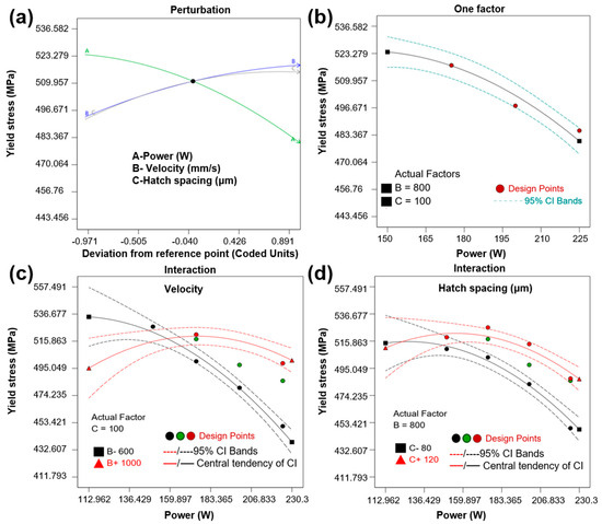 From Figure 8a, it can be observed that there is an approximately parabolic relationship between the laser power, scanning speed, hatch spacing, and yield strength. As the scanning speed (denoted as factor B) or hatch spacing increases, the yield strength also increases, indicating a positive correlation. Here, “B-600” and “B+1000” in the figure refer to specific levels of scanning speed, where B-600 represents a scanning speed of 600 mm/s and B+1000 represents a scanning speed of 1000 mm/s, selected as typical values to illustrate the influence trend of scanning speed on yield strength in the response surface analysis. A moderately high scanning speed (e.g., around B+1000) can improve the flow of the molten pool, reduce defects such as pores, increase the effective load-bearing area, and reduce stress concentration. However, an excessively high scanning speed beyond this range will lead to an increase in defects due to insufficient energy input, so there is an appropriate range. Figure 8b shows that as the laser power increases, the yield strength decreases, presenting a negative correlation. Meanwhile, the figure includes 95% confidence intervals (95% CI bands) to evaluate the reliability of the predicted values. The black solid line represents the predicted trend line, the red dots are the experimental design points, and the light-blue dashed lines are the 95% confidence interval. It can be seen from Figure 8c,d that factor A (laser power) is involved in multiple interactions. The trend shows that as the laser power (A) increases, the yield strength decreases. This is because a high energy density causes a high melting temperature in the molten pool. Subsequently, rapid cooling of the molten pool generates high residual stresses and pores, which in turn lead to a decrease in performance.