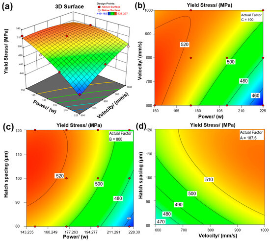 (a) Effect of different factors on yield strength; (b) Effect of laser power on yield strength; (c) Effect of laser power and scanning speed on yield strength; (d) Effect of laser power and hatch spacing on yield strength.