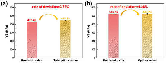 To validate this method, two sets of processing parameters recommended by the software were experimentally tested: the optimal set (P = 150 W, H = 110 μm, v = 700 mm/s) for maximizing yield strength, and a sub-optimal set (P = 225 W, H = 80 μm, v = 800 mm/s), listed in Table 6. The given process parameters were rounded up, and three samples were printed for each set of processes. For the three specimens fabricated under the optimized process parameters, the coefficient of variation (standard deviation divided by the mean) of the experimentally measured yield strength was only 0.88%. In comparison, specimens produced using sub-optimal parameters exhibited a coefficient of variation of 0.45%. These small deviations indicate that the process is stable and exhibits high reliability. In addition, by comparing the actual values with the predicted values, the deviation rate between the actual value and the predicted value for the optimized process was 3.72% (Figure 10a), and for the sub-optimal process, the deviation rate was 0.26% (Figure 10b). When making predictions through the RSM, it is generally considered that a deviation rate within 10% between the predicted value and the experimental value is reliable. Therefore, in this study, the RSM was used to predict the optimal process parameters and mechanical properties of 316L stainless steel, and the selected mathematical model was effective and had a high prediction accuracy.