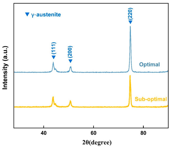 Figure 11 shows the X-ray diffraction (XRD) patterns of the optimal sample and the sub-optimal sample. XRD pattern analysis reveals that the only detectable crystalline phase in both samples is austenite, which is consistent with the general results of 316L stainless steel fabricated by the LPBF process—under rapid cooling rates (105–108 K/s) similar to those in this study, the austenite phase is typically the main crystalline phase [31,32,33,34,35,36]. Therefore, the phase content is not the main factor contributing to the changes in performance.