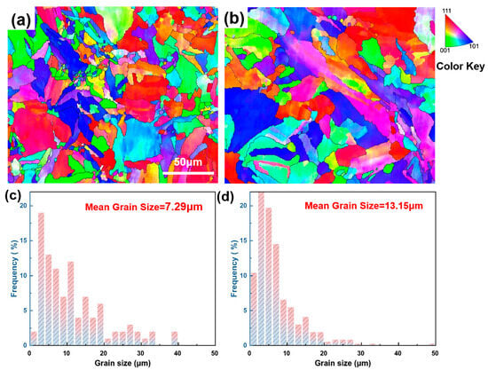 Grain distribution of LPBF-fabricated SS 316L specimens at different processes: (a) optimal specimen (VED = 62.5 J/mm3); (b) sub-optimal specimen (VED = 117.2 J/mm3); (c) average grain size: 7.29 μm; (d) average grain size: 13.15 μm.