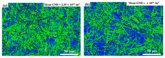 During the LPBF process, rapid cooling can lead to the accumulation of significant thermal stresses, which in turn induce plastic deformation in the microstructure. The accumulation of thermal stresses can cause plastic deformation in the microstructure [41]. Kernel average misorientation (KAM) values can quantify the degree of plastic deformation and reflect the concentration of thermal stresses or defect density [42]. In Figure 13a (the optimal sample), the green and yellow areas KAM are more widely distributed, indicating a higher cumulative amount of local plastic deformation and more significant interaction of dislocations. This is consistent with a higher geometric dislocation density (2.39 × 1014/m2), thereby enhancing the yield strength through the dislocation strengthening effect. Figure 13 shows the KAM maps and grain boundary angle distribution maps. In Figure 13a,b, the green regions represent higher KAM values, indicating that significant plastic deformation exists in these regions. The average grain boundary density in Figure 13a (2.39 × 1014/m2) is higher than that in Figure 13b (1.13 × 1014/m2), indicating that the material represented by Figure 13a has a higher grain boundary density, which typically implies smaller grain sizes in the material. This can improve the strength and hardness of the material.