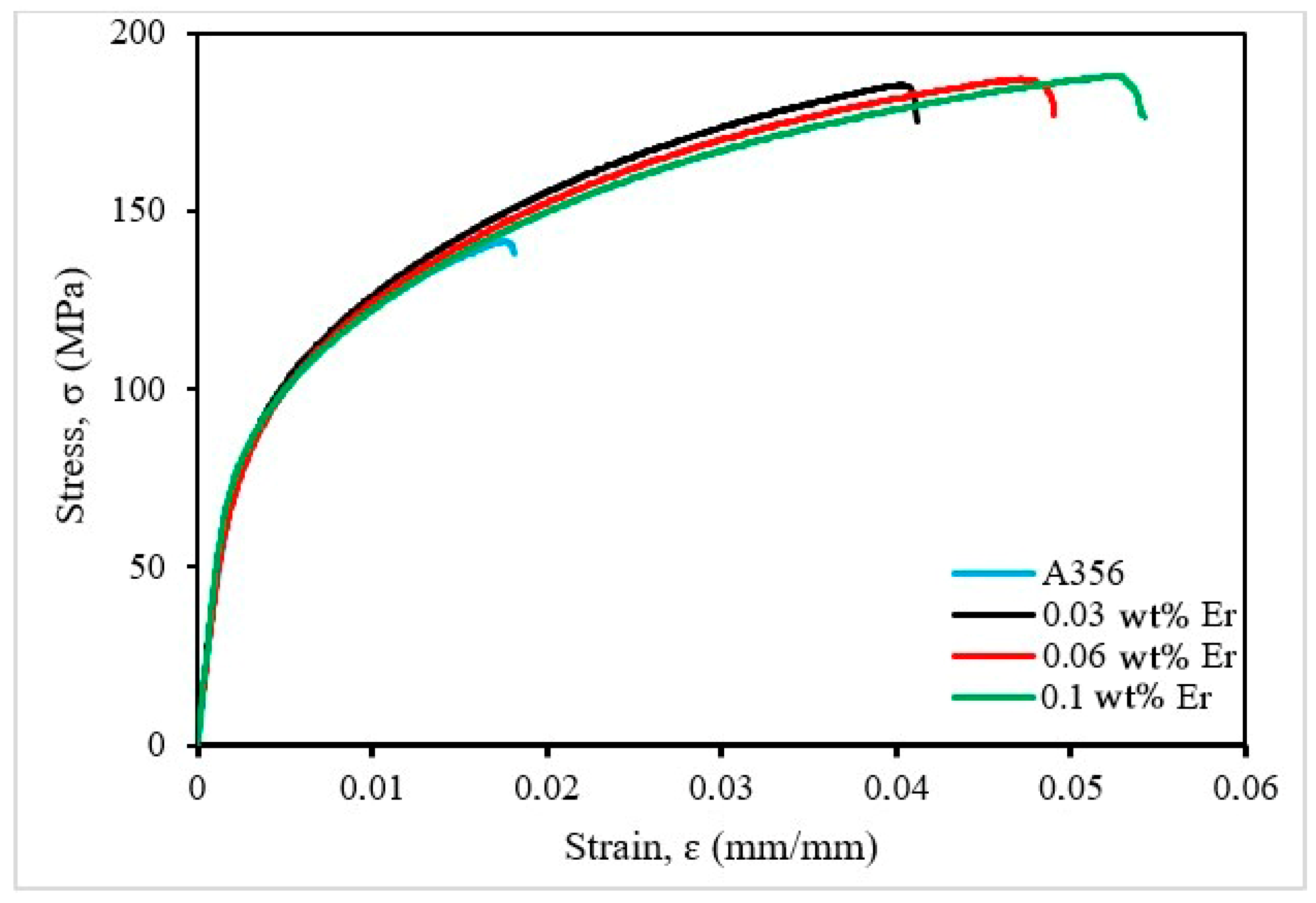 - The analyses clearly showed that Er addition has significant effects on the mechanical properties of A356 aluminum alloy. While the tensile stress values were 141.5 MPa in the casting without Er addition, these values increased by at least 30% to 185.4 MPa in 0.03 wt% Er addition, 187.0 MPa in 0.06 wt% Er addition, and 187.8 MPa in 0.1 wt% Er addition.