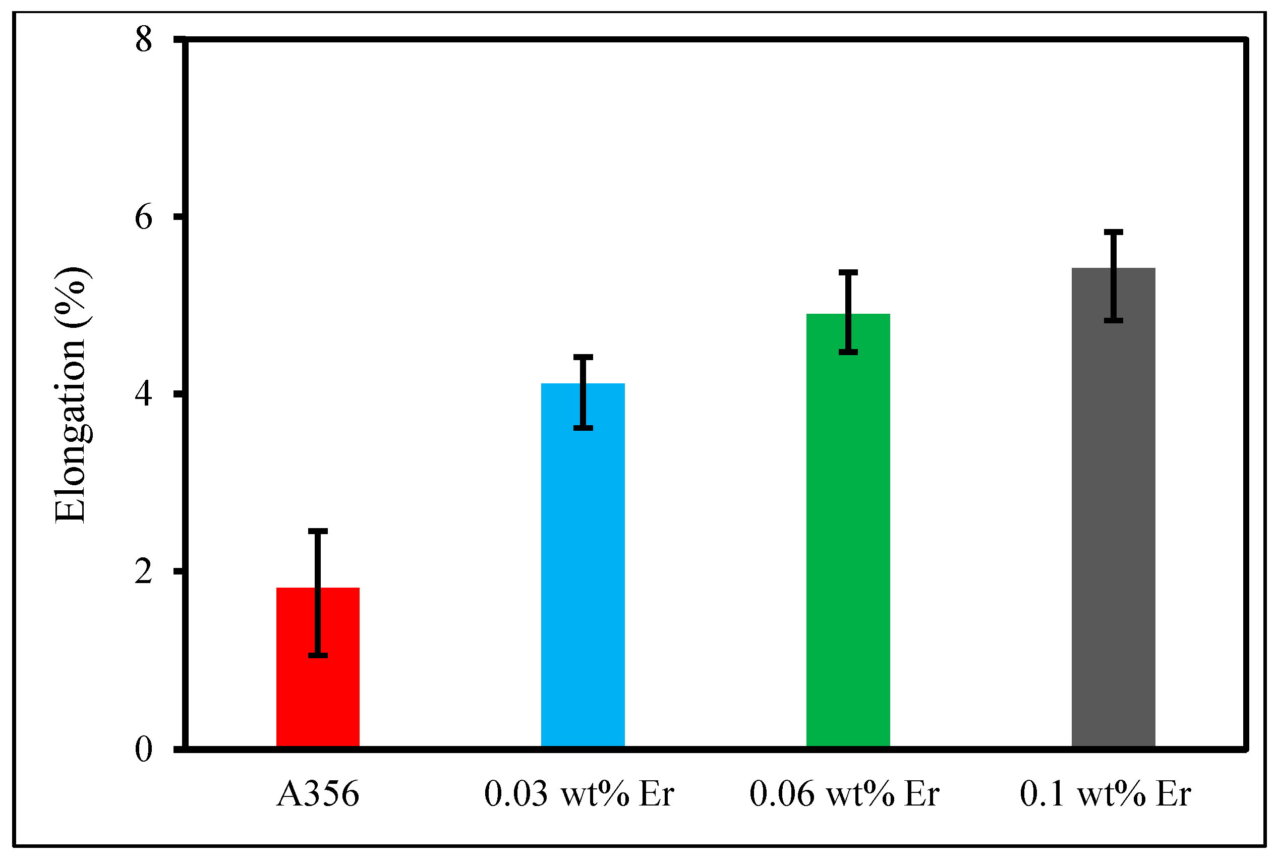 - When the elongation values were examined, it was seen that the Er addition improved the ductility of the material. The elongation rate, which was 1.816% in the casting without the Er addition, increased 4 times to 4.1% with the addition of 0.03 wt% Er, to 4.9% with the addition of 0.06 wt% Er, and to 5.4 wt% with the addition of 0.1% Er.