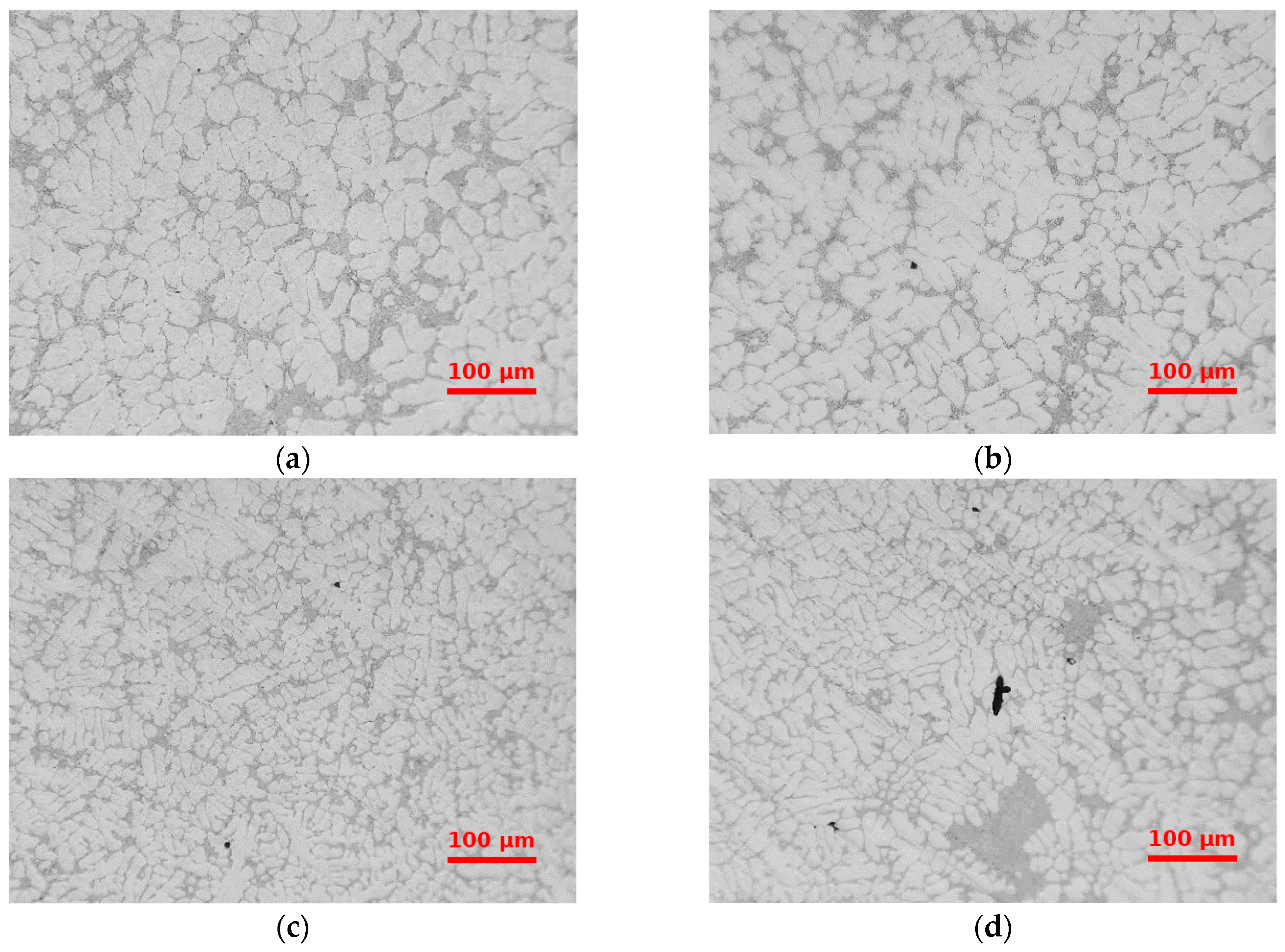 - Gursoy, O.; Colak, M.; Tur, K.; Dispinar, D. Characterization of properties of Vanadium, Boron and Strontium addition on HPDC of A360 alloy. Mater. Chem. Phys. 2021, 271, 124931. [Google Scholar] [CrossRef]