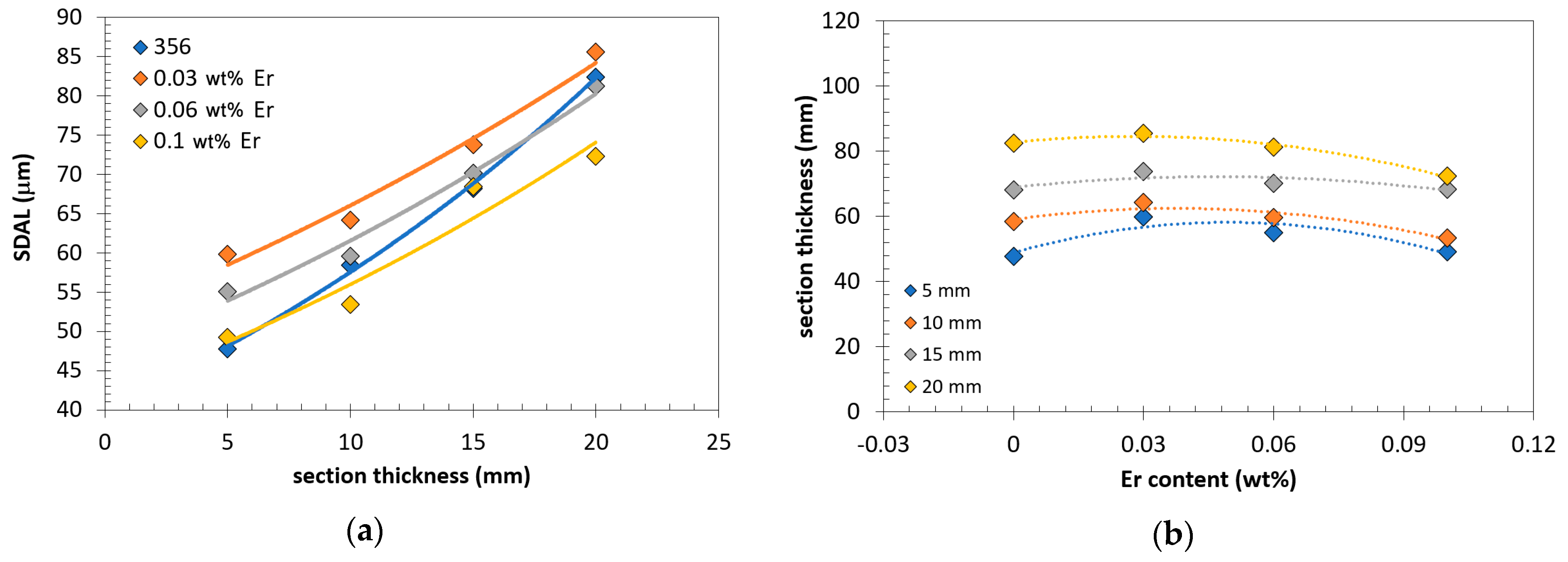 - With regard to the cooling rate, the SDAS was not affected by Er content at 5 mm thickness; however, as the thickness was increased to 20 mm, the SDAS values were decreased logarithmically from 24 to 18 μm.