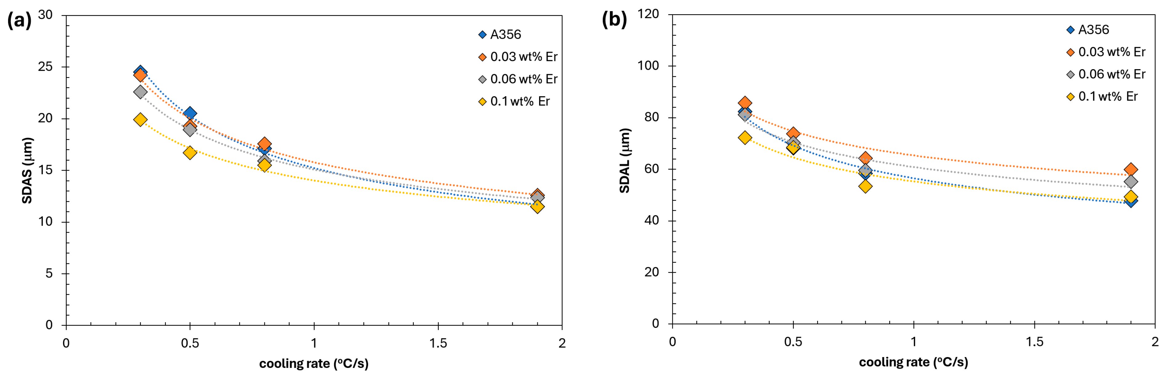- Patel, D.N.; Sutaria, M.P. Effect of Trace Rare Earth Er Addition on Microstructure and Tensile Properties of 319 Al-Si-Cu Alloy. Int. J. Met. 2022, 16, 2199–2209. [Google Scholar] [CrossRef]