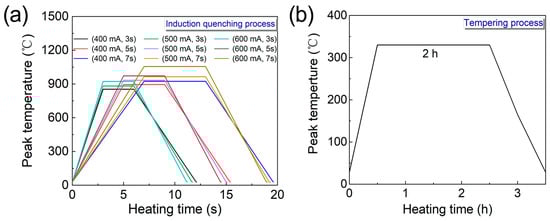 The raw material used was the bar-shaped quenched and tempered (Q&T) 34CrNiMo6 steel [20]. The steel underwent the initial Q&T process, which involved holding at 850 °C for 50 min, followed by quenching, and then tempering at 600 °C for 2 h, resulting in tempered sorbite (a mixture of ferrite and cementite). The Q&T 34CrNiMo6 steel rods were machined into cylindrical specimens (80 mm in length, 15 mm in diameter). High-frequency induction quenching was performed using a GY-25AB induction heating power supply (Dongguan Guangzhiyuan Electronic Technology Co., Ltd., Dongguan, China) based on electromagnetic induction principles [21]. The induction coil had an inner diameter of 20 mm and a 2 mm gap, with a minimum current of 200 mA. The copper coil carrying alternating current rapidly heated the surface of the metal workpiece when positioned near it, followed by immediate cooling. This process imparted high hardness and wear resistance to the surface while maintaining excellent toughness in the core [22]. By adjusting the quenching current (400, 500, and 600 mA) and heating duration (3, 5, and 7 s) with AQ251C quenchant cooling, rapid heating and cooling were achieved to control hardened layer thickness and hardness. The peak temperature was recorded in real-time using a SCIT-1MK1A infrared thermometer with an accuracy of ±5 °C (China Science Infrared Technology Co., Ltd., Beijing, China). The parameters of the induction quenching process, including surface peak temperature, heating rate, and cooling rate, are summarized in Table S1. The induction quenching process is illustrated in Figure 1a. After induction quenching, the specimens were tempered in a MICRO-X box resistance furnace (Micro-X Ltd., Tonsley, South Australia) at 330 °C for 2 h. The heating rate was 50 °C/min, followed by cooling to room temperature at a rate of 5 °C/min, as shown in Figure 1b.