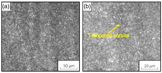 Optical micrographs of initial Q&T 34CrNiMo6 steel at different magnifications: (a) ×100; (b) ×500.