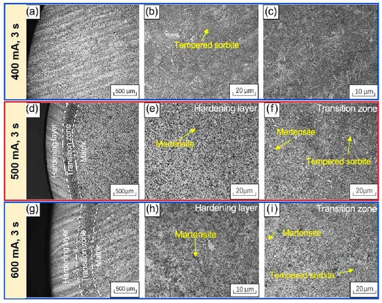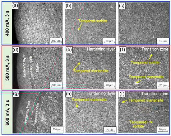 Optical micrographs of 34CrNiMo6 steel under tempering at different induction currents: (a–c) 400 mA, 3 s; (d–f) 500 mA, 3 s; (g–i) 600 mA, 3 s.