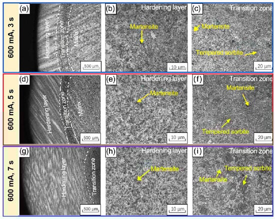 Furthermore, the effect of quenching duration on microstructural evolution in 34CrNiMo6 steel was investigated using induction quenching at a fixed current of 600 mA with varying heating times (3, 5, and 7 s), as shown in Figure 5. Metallographic analysis reveals that specimens subjected to 600 mA induction quenching consistently exhibit a structure comprising hardened layer, transition zone, and matrix. High temperatures partially transform tempered sorbite into martensite, constituting the primary phase in the hardened layer. The transition zone consists of martensite and tempered sorbite, exhibiting a composite structure, while the matrix retains its tempered sorbite characteristics. Figure 5a–c display the microstructure after 600 mA, 3 s quenching, with hardened layer and transition zone thicknesses measuring 0.63 mm and 0.31 mm, respectively. When heating duration extends to 5 s (Figure 5d–f), the hardened layer thickens to 1.75 mm and transition zone expands to 0.57 mm. At 7 s heating (Figure 5g–i), these dimensions further increase to 2.93 mm and 1.18 mm.