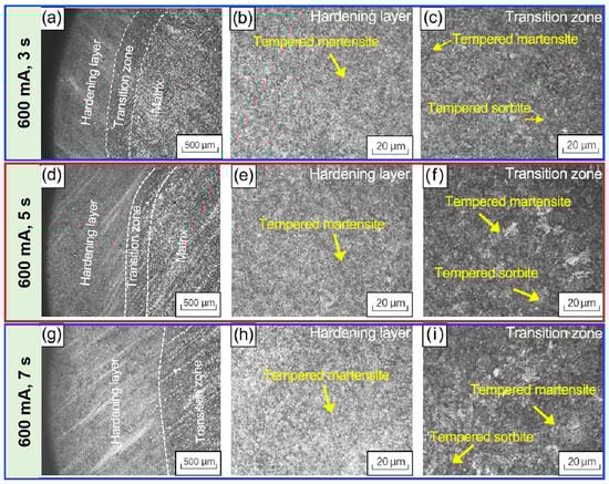 After tempering the aforementioned specimens quenched with different durations at 330 °C for 2 h, the microstructural evolution is shown in Figure 6. The sustained high temperatures during tempering promote the transformation of sorbite into tempered martensite, which characterizes the structural features of the hardened layer. The transition zone displays a mixed microstructure composed of tempered martensite and tempered sorbite, reflecting a gradual transition in hardness and phase composition. In contrast, the matrix retains its original tempered sorbite structure, which serves to balance the overall toughness of the material. For the specimens quenched at 600 mA with 3 s heating followed by tempering (Figure 6a–c), the hardened layer and transition zone are measured at thicknesses of 1.40 mm and 0.51 mm, respectively. When heating duration increases to 5 s (Figure 6d–f), post-tempering thicknesses reach 2.13 mm (hardened layer) and 0.42 mm (transition zone). At 7 s heating (Figure 6g–i), these dimensions further increase to 3.21 mm and 0.74 mm.