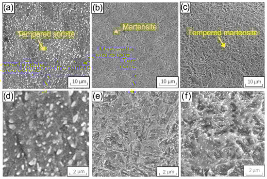 SEM morphologies of hardened layer surfaces in 34CrNiMo6 steel after Q&T, quenching and tempering (600 mA, 7 s): (a,d) Q&T specimen; (b,e) as-quenched specimen; (c,f) tempered specimen.