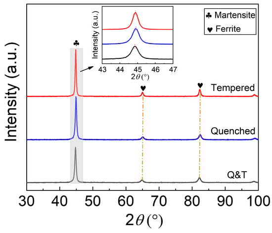 In addition, XRD analysis was performed on different samples after induction quenching–tempering, as shown in Figure 8. All samples mainly consist of martensite and ferrite. Both martensite and ferrite are BCC phases, with no other phases formed. The presence of thermal stress from surface quenching leads to lattice distortion in the hardened layer, resulting in reduced interplanar spacing, refined grains, significantly increased dislocation density, and a rightward shift of martensite diffraction peaks. The surface layer of tempered samples is mainly composed of tempered martensite and ferrite. The tempering process releases the residual compressive stress on the sample surface, causing the diffraction angle of martensite to shift leftward, which indicates an increase in interplanar spacing and a decrease in dislocation density after tempering.
