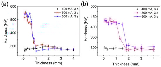 The distinct phase structures formed in 34CrNiMo6 steel during quenching–tempering critically influence its microhardness evolution [33]. Figure 9 displays microhardness profiles under the quenching–tempering process at identical 3 s durations with varying induction currents (400, 500, 600 mA). Figure 9a shows the microhardness distribution curve of quenched specimens. At 400 mA, no hardened layer is observed, with the microstructure remaining as tempered sorbite. The hardness is relatively low, with an average value of 287.24 HV, and there is no significant gradient in hardness across the specimen. When the induction current increases to 500 mA, the hardness of the hardened layer averages 508.64 HV, while the matrix hardness is 284.43 HV. At 600 mA, the hardness of the hardened layer rises to 524.73 HV, with the matrix at 272.82 HV. The microhardness shows a clear decreasing trend with increasing cross-sectional depth under higher currents. In addition, as can be seen from Figure 7d,e and EDS analysis (Tables S2 and S3), the hardened layer of quenched specimens is predominantly martensitic, with carbide size and content significantly lower than those of the Q&T specimens. The hardness here is primarily governed by the lattice distortion strengthening and dislocation strengthening mechanisms inherent to martensite, resulting in extremely high surface hardness. Figure 9b presents the microhardness curve after tempering. For the 400 mA, 3 s specimen post-tempering, no hardened layer is formed, and the average hardness is 294.87 HV, showing no significant gradient. For the 500 mA, 3 s specimen after tempering, the hardened layer has an average hardness of 425.75 HV, while the matrix hardness averages 291.68 HV. The 600 mA, 3 s specimen after tempering shows a hardened layer average hardness of 419.17 HV and a matrix average hardness of 304.48 HV. After tempering, the martensite decomposes and carbides precipitate exhibiting increased content compared to the quenched specimens (Figure 7e,f). These carbides maintain a relatively high hardness through “dispersion strengthening” while alleviating the internal stress of martensite and preventing excessive brittleness [34]. As a result, the nano-sized carbides precipitate dispersedly, tempered martensite/sorbite has lower hardness compared to quenched martensite, and the reduction in residual stress contributes to the decreased hardness of the hardened layer.
