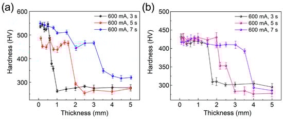 Figure 10 illustrates the microhardness evolution of 34CrNiMo6 steel specimens under the induction quenching–tempering process at 600 mA with varying heating durations of 3, 5, and 7 s. Figure 10a displays the microhardness curves of induction-quenched specimens under different heating durations. Higher induction current transforms tempered sorbite into martensite throughout the hardened layer. Martensite exhibits higher hardness while the matrix shows lower hardness; therefore, all microhardness curves demonstrate distinct declining trends. The 600 mA, 3 s specimen exhibits hardened layer average hardness of 524.73 HV and matrix average hardness of 272.82 HV. The 600 mA, 5 s specimen exhibits hardened layer average hardness of 477.36 HV and matrix average hardness of 268.84 HV. The 600 mA, 7 s specimen exhibits hardened layer average hardness of 521.48 HV and matrix average hardness of 316.79 HV. With increasing heating duration, the hardened layer thickness gradually increases, forming high-strength and high-hardness martensite structures, consequently elevating microhardness. In the transition zone, reduced martensite content causes a slight hardness reduction. The matrix, primarily composed of low-hardness and high-ductility tempered sorbite, consequently exhibits decreased hardness. Figure 10b presents microhardness curves after tempering treatment. The 600 mA, 3 s specimens show a hardened layer average hardness of 419.17 HV and a matrix hardness of 304.48 HV. The 600 mA, 5 s specimens show a hardened layer average hardness of 422.28 HV and a matrix hardness of 284.76 HV. The 600 mA, 7 s specimens show a hardened layer average hardness of 417.94 HV and a matrix hardness of 289.65 HV. Post-tempering hardness distribution trends align with those of the quenched specimens: the maximum hardness is found in the hardened layer and the minimum in the matrix, with consistently declining curves. Tempering reduces the hardness of the hardened layer compared to quenching by alleviating internal residual stresses and mitigating brittleness.