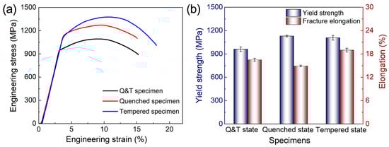 Tensile properties of specimens after induction quenching–tempering: (a) stress–strain curve; (b) yield strength and fracture elongation.