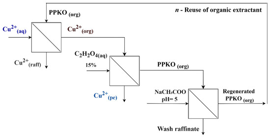 Subsequently, to maintain the efficiency of the extractant phenyl-2-pyridyl ketoxime (PPKO) and enable its reuse over multiple cycles, a chemical reconditioning procedure was implemented at the end of each stripping stage. This consisted of washing the organic phase with a sodium acetate buffer solution adjusted to pH 5 in order to restore the protonated state of the oxime functional group, thereby compensating for the loss of protonation and the positive charge caused during the stripping step with oxalic acid. In order to evaluate the recycling capacity of the extractant, five consecutive extraction–stripping–reconditioning cycles were carried out. In each cycle, the reconditioned organic phase was reused under identical experimental conditions (Figure 2). The copper-loading capacity of the extractant in each cycle was determined indirectly by measuring the concentration of Cu(II) in the aqueous phase before and after contact with the organic phase, using atomic absorption spectroscopy (AAS). This information allowed for the calculation of the amount of copper transferred to the organic phase at each stage.